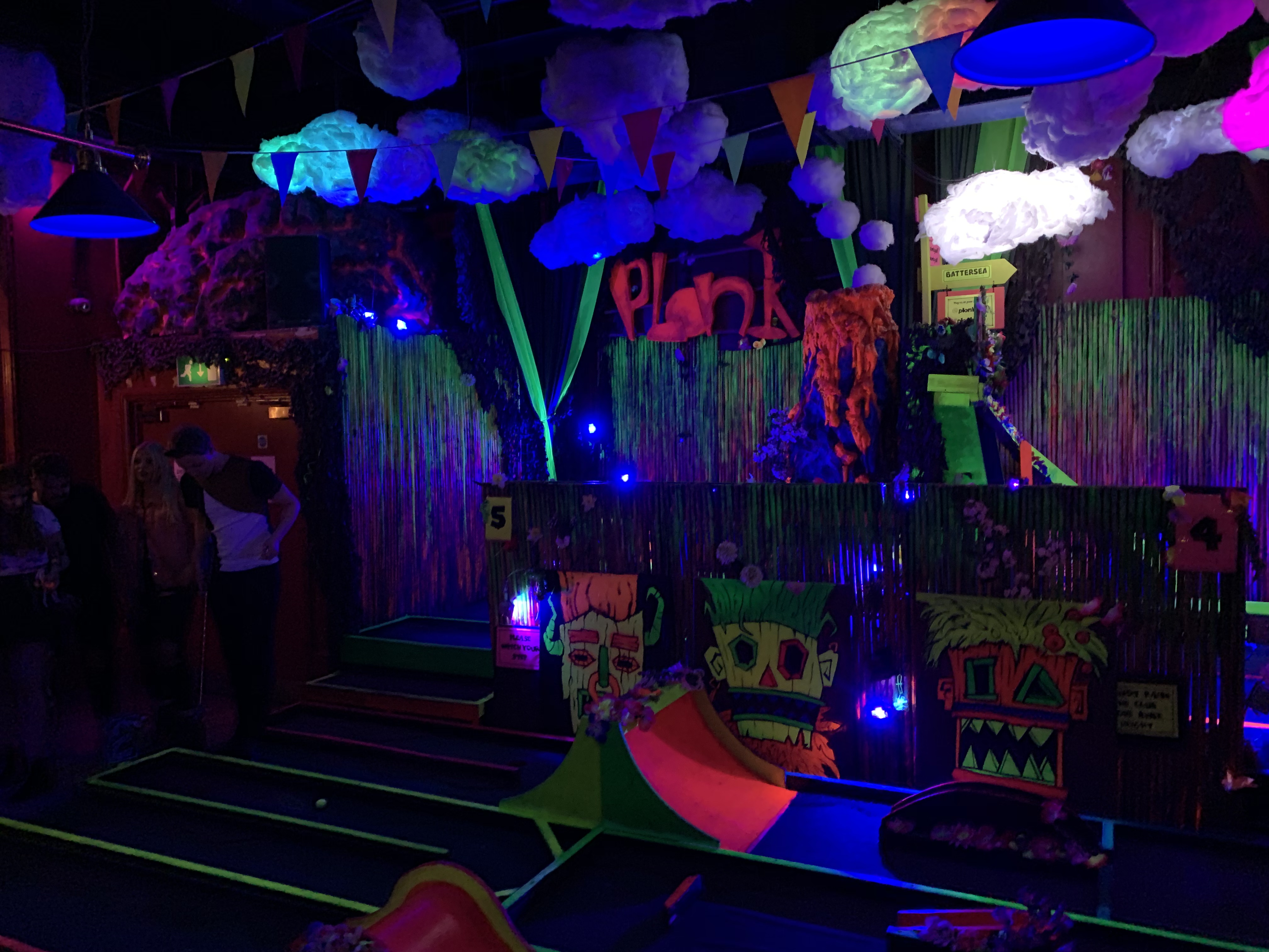 After that, head over to the other end of the room for one of the strangest mini-golf courses around. Made of plywood and astroturf and painted with fluorescent paint, you can pick up a club and a golf ball from a booth on the right and then make your way around the course. It can get a tad congested if people take it too seriously, but gives you more than enough opportunity to laugh and have fun with your date as you swing or miss your way around the course.